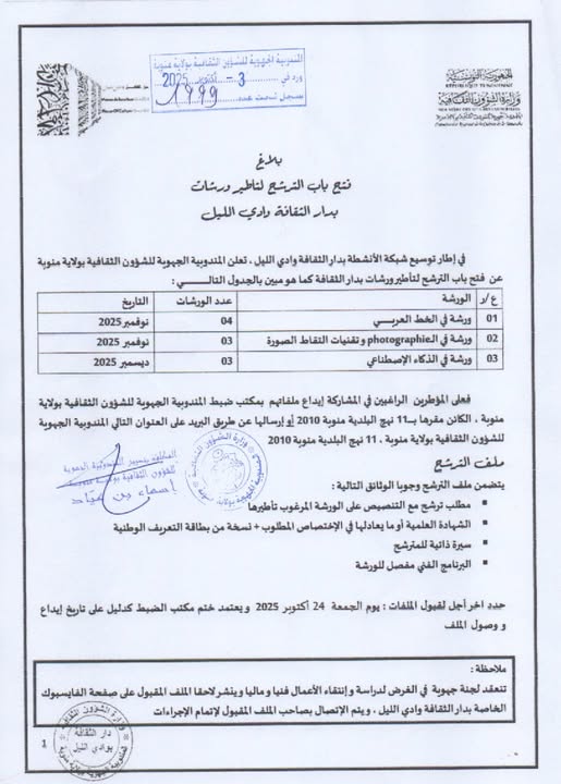 غير مصنفبلاغ فتح الترشح لتأطير ورشات بدار الثقافة وادي الليل المندوبية الجهوية للشؤون الثقافية بمنوبة3 أكتوبر 202513 أكتوبر 202501 mins عدد المشاهدات 4 تصفّح المقالات Previous: بلاغNext: استشارة حول إقتناء عرض فني