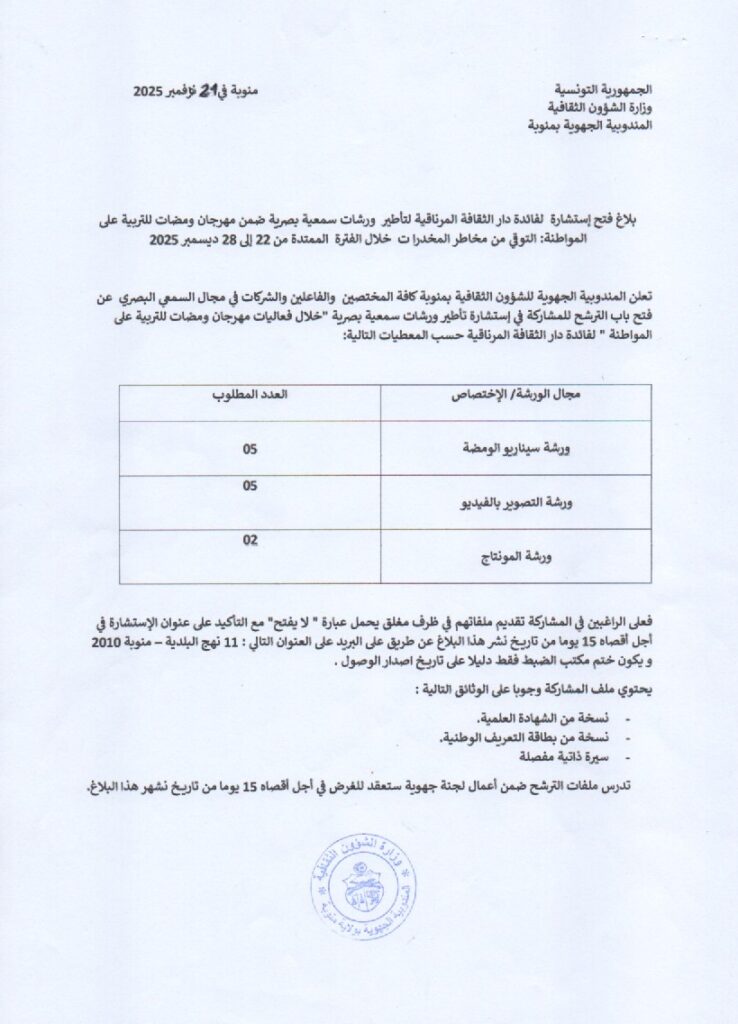 بلاغ فتح استشارة لفائدة دار الثقافة المرناقيّة لتأطير ورشات سمعيّة بصريّة ضمن مهرجان ومضات للتربية على المواطنة للتوقّي من مخاطر المخدّرات خلال الفترة الممتدة من 22 إلى 28 ديسمبر2025.