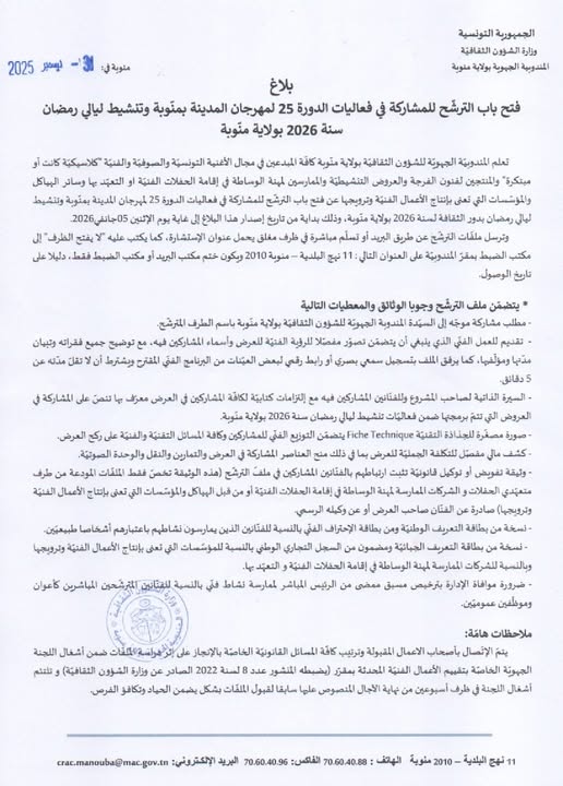 غير مصنفبلاغ حول الترشح للمشاركة في فعاليات مهرجان المدينة بمنوبة و تنشيط ليالي رمضان بولاية منوبة المندوبية الجهوية للشؤون الثقافية بمنوبة3 ديسمبر 202501 mins بلاغ فتح باب الترشّح للمشاركة في فعاليات الدورة 25 لمهرجان المدينة بمنّوبة وتنشيط ليالي رمضان سنة 2026 بولاية منّوبة آخر أجل لتقديم الملفّات الإثنين 05جانفي2026. عدد المشاهدات 83 تصفّح المقالات Previous: بلاغ خاص بفتح إستشارةNext: أيام المسرح بمنوبة