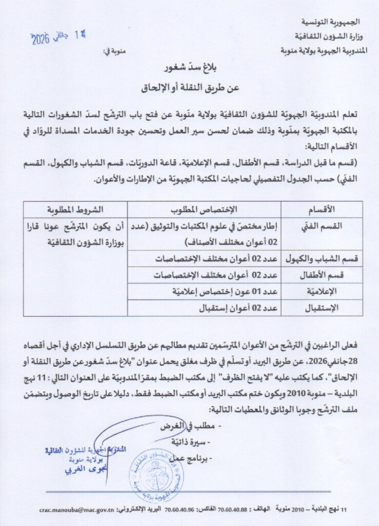 بلاغ سدّ شغور (عن طريق النقلة أو الإلحاق) لفائدة مجموعة من المكتبات العموميّة بولاية منّوبة.