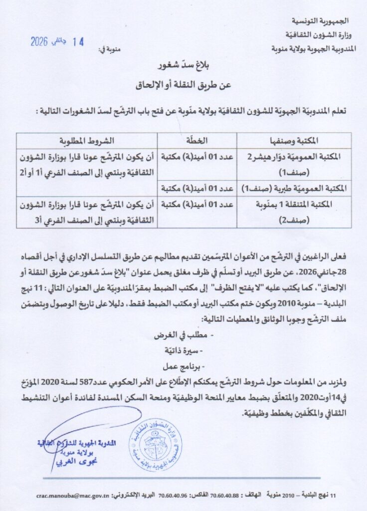 بلاغ سدّ شغور (عن طريق النقلة أو الإلحاق) لفائدة مجموعة من المكتبات العموميّة بولاية منّوبة.