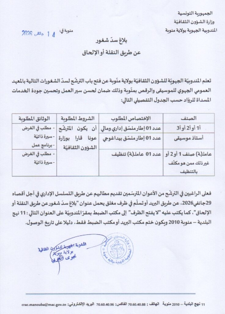 بلاغ سدّ شغور (عن طريق النقلة أو الإلحاق) لفائدة المعهد الجهوي للموسيقى والرقص بمنّوبة.