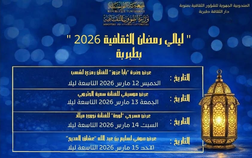 غير مصنفليالي رمضان الثقافية بطبربة المندوبية الجهوية للشؤون الثقافية بمنوبة9 مارس 20269 مارس 202601 mins عدد المشاهدات 4 تصفّح المقالات Previous: بلاغ سد شغور خاص بالمكتبات العمومية