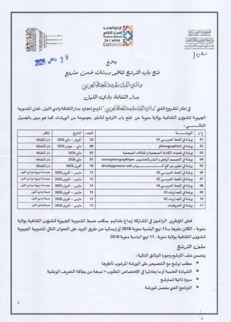 غير مصنفبلاغ فتح باب الترشح لتأطير ورشات بدار الثقافة وادي الليل المندوبية الجهوية للشؤون الثقافية بمنوبة29 يناير 202629 يناير 202601 mins عدد المشاهدات 9 تصفّح المقالات Previous: بلاغ حول سد شغورات بالمكتبات العمومية بمنوبة