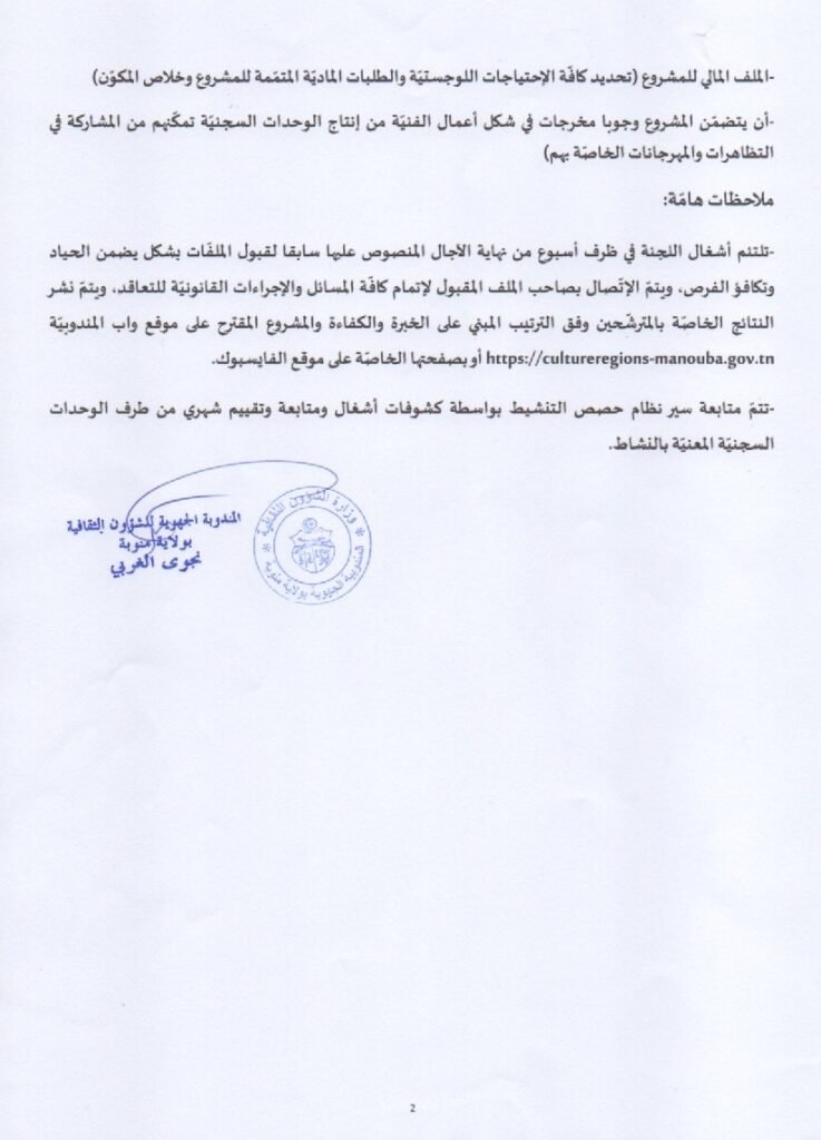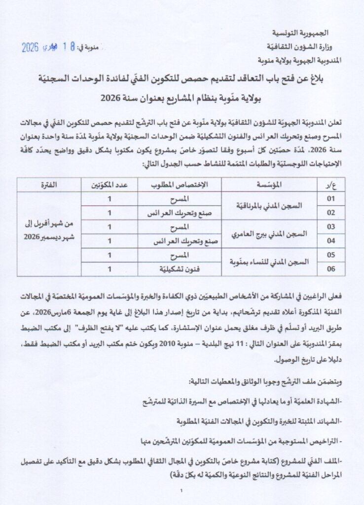 فتح باب التعاقد لتقديم حصص للتكوين الفنّي لفائدة الوحدات السجنيّة بولاية منّوبة بنظام المشاريع بعنوان سنة 2026
