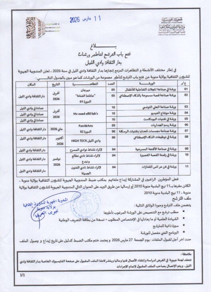 غير مصنفبلاغ فتح باب الترشح لتأطير ورشات بدار الثقافة وادي الليل المندوبية الجهوية للشؤون الثقافية بمنوبة11 مارس 20262 أبريل 202601 mins عدد المشاهدات 11 تصفّح المقالات Previous: ليالي رمضان الثقافية بطبربةNext: خرج المسرحي اللي فيك بدار الثقافة برج العامري